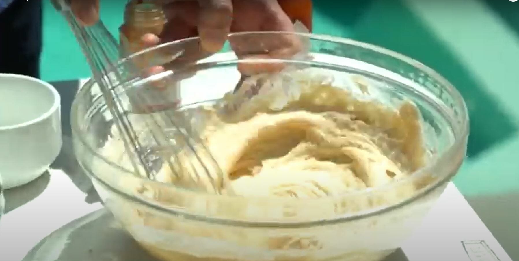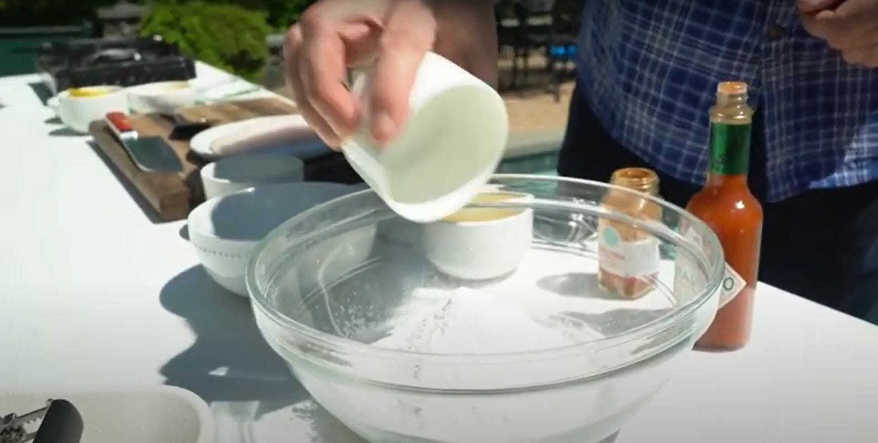 NR – (1:17) Now we’re gonna put a little bit of seasoning in here. So we’re gonna go in with some kosher salt, and some paprika as well. Now we’ve got to go with some wet ingredients. So we’re gonna start off with an egg. And then we’re gonna go in with some fish broth. Gotta go in with a couple of shots of Tabasco that’s going to add some spice, also a little bit of acidity from the vinegar, but nothing adds acidity quite like a lemon. Let’s go in with a touch of lemon. Now let’s give it a whisk. So that’s what you want to see right there. You want batter that tries to hide inside the whisk, but still comes out when you want it to.
