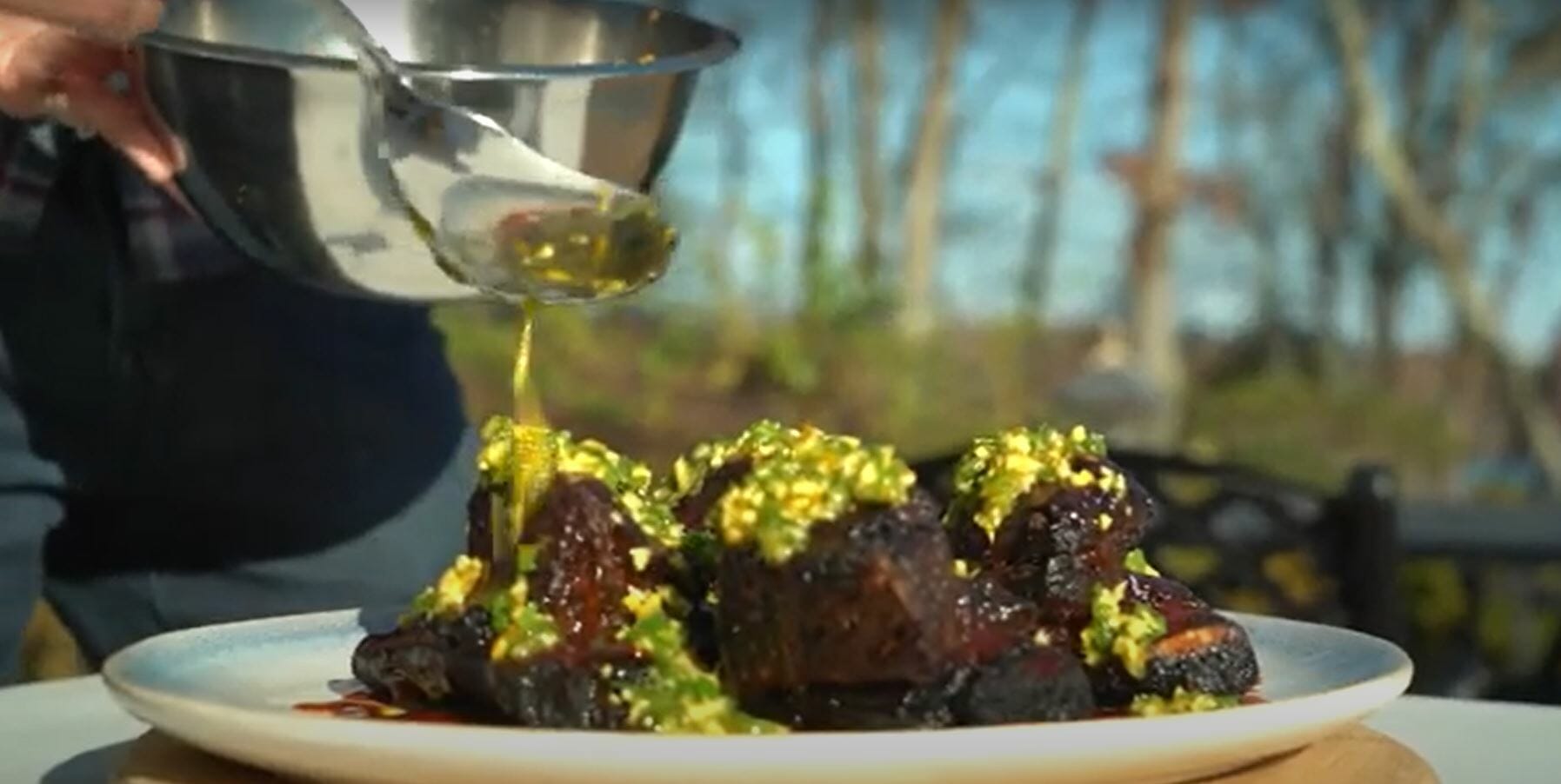 Tracy & Nick Rabar – 5:07 – Well, you know what, Nick, I think I have the perfect complement to these gorgeous short ribs. And today we’re going to make my famous ginger scallion sauce, but we’re going to punch it up a little bit with some fresh Clementine…. I’m sold. So the first thing we need to do is take our beautiful clean ginger, and we’re going to chop that up. This requires a lot of ginger, about a third of a cup if you can believe that. Alright, so the next step, we’re going to add our olive oil, we want to use a very mild olive oil in this recipe. We don’t want the olive oil to overpower the sauce, and we’re going to do about a third of a cup of that as well. The next thing we’re going to do is we’re going to add in some of our toasted sesame oil, and we’re going to add about a teaspoon. Okay, the next ingredient we’re going to use is some fresh chopped garlic, all my favorite about a teaspoon of that. And then we’re going to go in with our scallion. This is about one bunch, maybe one and a half, so you got a good size couple of scallion they’re going to add that right in. So the next thing we’re going to add is a juice of one Clementine, pop it over your hands, you don’t get any seeds in the bowl. So after the juice what’s next? So we’re going to zest, we’re going to add the zest of two Clementines. We’re going to use this micro planar and zest it right over the bowl. The last ingredient we’re going to add is a nice pinch of kosher salt, I would say about a quarter of a teaspoon. And then we’re going to take our whisk and we’re going to gently whisk this together. And that’s pretty much it. Want to make sure you scrape down the sides of that bowl and get every little bit. All right. Just when you thought you had the perfect short rib. Now they’re even better. Oh my look at that. So you have the smoky short rib, the maple soy barbecue and now this incredible orange ginger. gremolata. Those are stutters they sure are glad I stopped by, me too. And listen, would you like to do the honors? If I must, you must, until we meet again guys keep on cooking.