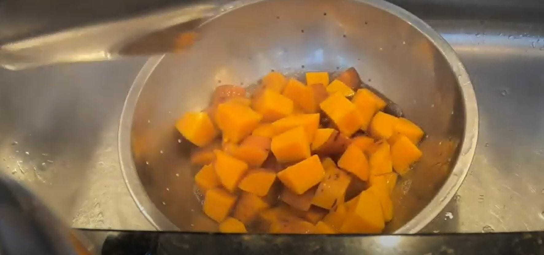 00:35 To make this dish, we’re gonna need sweet potatoes Applewood bacon, some beautifully caramelized leeks, heavy cream, gruyere cheese, fontina, parmesan and some fresh chop thyme. We’re going to get started by chopping up some of these sweet potatoes. Sweet potatoes can often come with a little bit of a fibrous end. So I’m just going to remove that, cut it in half, and then we’re gonna cut them like a large dice. Leaving the skin on we’re gonna cut these to nice equally sized pieces. Time for these babies to hit the jacuzzi. Alright, we’re going to pop them right in there, starting from cold water. Hit’em with a pinch of kosher salt. Fire it up high heat 20 minutes guys let them do their thing.
