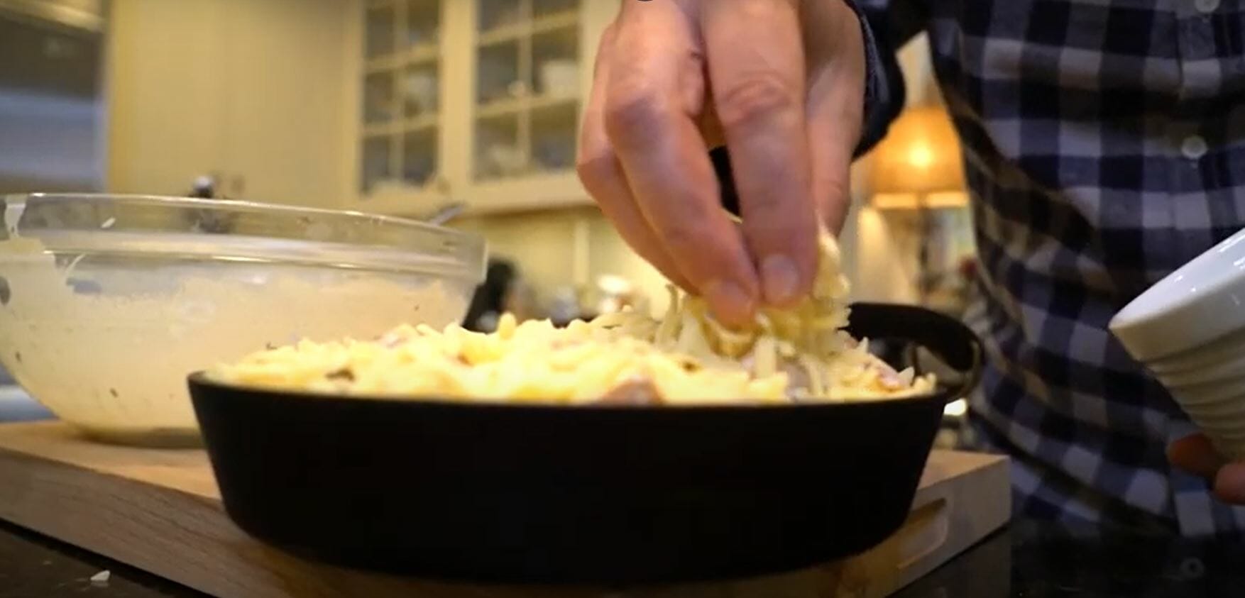 2:53 Let’s go put this together. Alright guys, this is where it gets good. We want to mix all these ingredients together before we placed them in the baking vessel. So we’ve pre cooked our sweet potatoes here, which is essential because we can control the doneness of the potato. Now I have my pre-caramelized leeks, which are going to go right into the mix. Bacon, which we’ve touched on but didn’t really talk about beautiful large cut bacon, we don’t want this bacon to be lost. This is a sweet potato and bacon au gratin. Let all that bacon fat drip in there. Pinch of thyme. Right in now, let’s go. Let’s go chasing waterfalls, put in that Mornay sauce. Okay, you want a little bit extra and I’m going to explain to you why in just a minute. So now that all of that is combined, we’re going to mix it, mix all that up beautifully. And now what you’re going to do is you’re going to go into a baking dish of your choosing. I’m using this cast iron pan. It’s actually made right in Providence, Rhode Island by Matt a graduate who owns Nest Homeware he makes incredible cast iron pans. Now, as you see we’re going in, we want this to have nice, a nice amount of cream because we’re not done with the cheese yet. Okay, we’re gonna place this gruyere cheese on top all the way to the edge. And now we’re going to bake it. We’re gonna preheat the oven at 500 degrees. All right, pop it in. High heat. See? So now you got about 15 minutes I’ll go ahead and kill some time