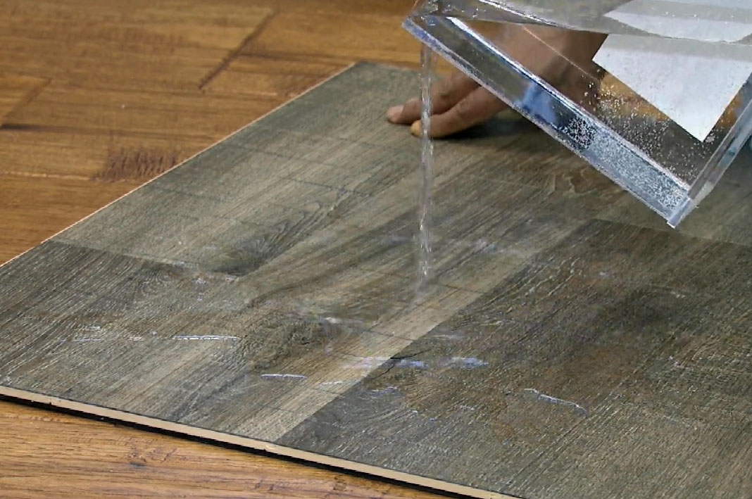 When he removes the plank it has stayed intact and is not damaged by the water. He pours water from the container directly to the flooring on the floor and shows it is waterproof. When the flooring has contact with water it will not warp, damage, or deform in any way. Tran notes surface water can be quickly picked up with a rag. He says this waterproof flooring can be installed in bathrooms, laundry room, kitchens and the entire house without worry.