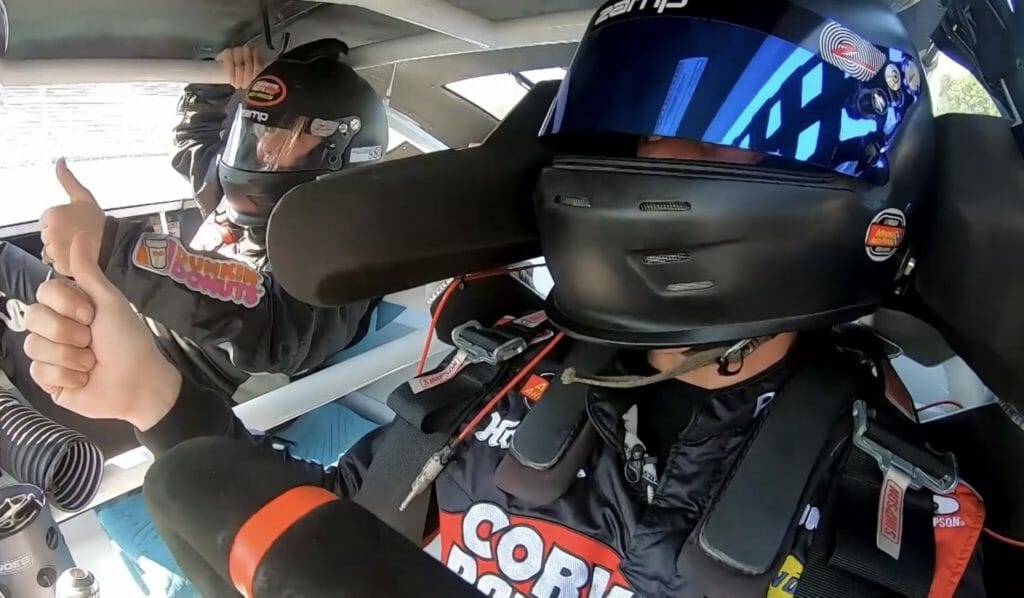 Mark helps Ashley suit up in the proper safety gear, then she gets in the car. It’s time to rock and roll- NASCAR style!