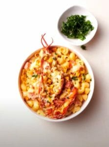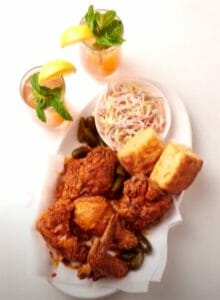 CH (02:05) – Okay, so the mac and cheese. That’s a celebration dish. When you add a tail of lobster and claw meat, we have upped the celebration to the lobster mac and cheese with cornbread croutons. We have my hot chicken on the menu – hot chicken with biscuits and a coleslaw with some spicy pickles. But to start, because there’s never a party without deviled eggs, there are short cut deviled eggs, come on.