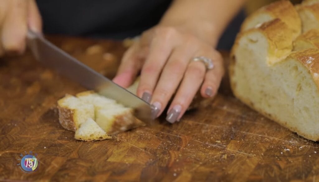 First, Karen used a serrated knife to cut a loaf of bread into half inch by half inch cubes. Then she placed all of her cubes on a cookie sheet and put into a 400 degree oven, for about 10 minutes.