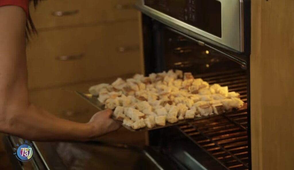 Remove the bread cubes from the oven, turn off the broth burner, and take a moment to enjoy the aroma of your kitchen. For the rest of the recipe, you will have to watch the full video! But trust us, you don’t want to miss it.