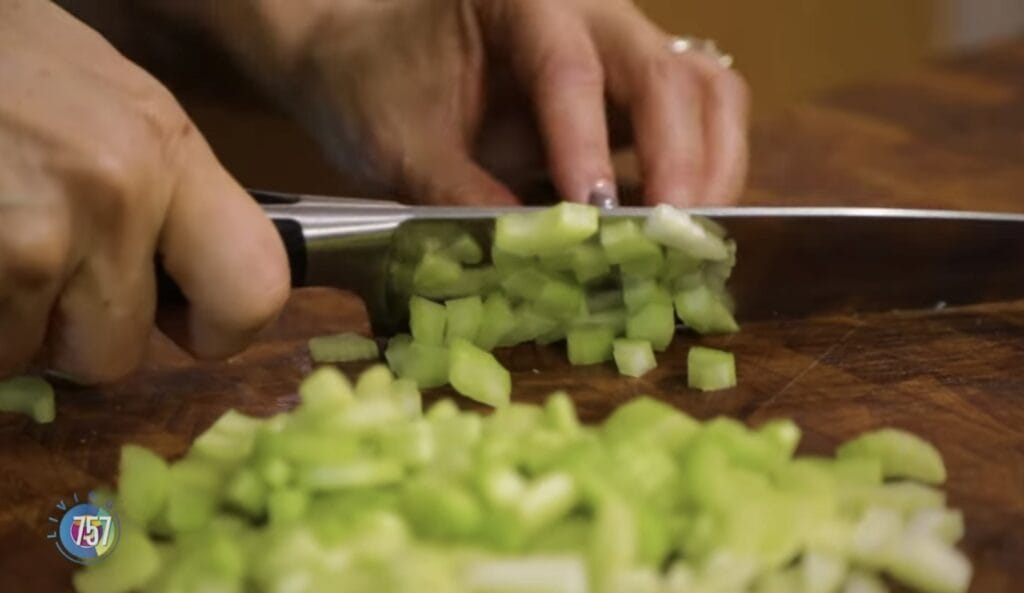 Next, chop up about a cup of both onion and celery. It doesn’t have to be exactly a cup, but do make sure that you are doing a “small chop” for these two ingredients. When you’re done, grab your pan and add a drizzle of good quality olive oil. Turn your stove on to high and let the oil heat up.