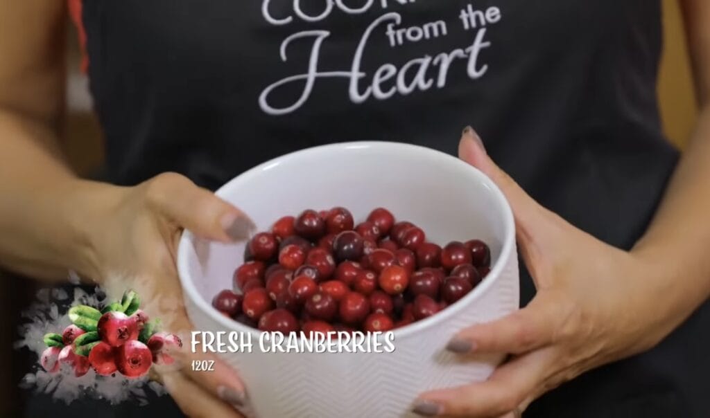 Now, it’s time for Karen’s magical fresh cranberry sauce. Start with a twelve ounce bag of fresh cranberries, give them a rinse and add them to a bowl!