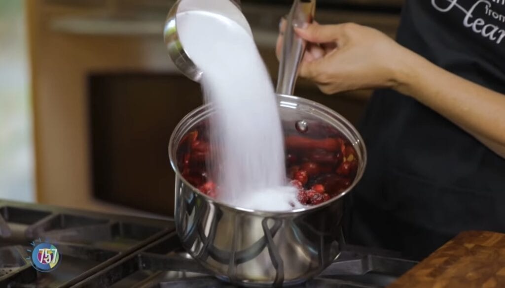 Turn your stove to medium-high, and add your fresh cranberries to a pot. Next, add one cup minus two tablespoons of water to the pot. After you’ve added your water, it’s time to sweeten the deal by adding a cup of sugar! You can add a little more or a little less, depending on how sweet you like your sauce.