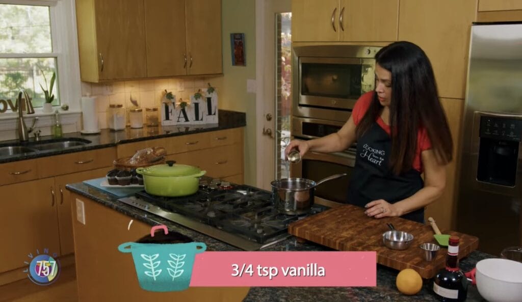 Turn the heat down to medium, and add a quarter cup of cinnamon. Karen is using a delicious Mexican cinnamon, which was totally worth the splurge for this holiday side dish! After the cinnamon, add 3/4 of a teaspoon of Madagascar Vanilla.