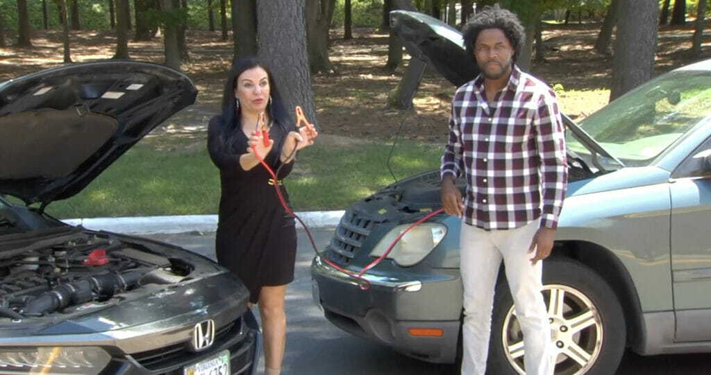 How simple is it? Well, take a look as Patricia shows Quincy how to jump start a vehicle. And yes, she does it in heels! All you need is a pair of jumper cables and that can-do spirit!