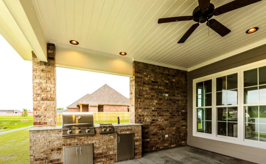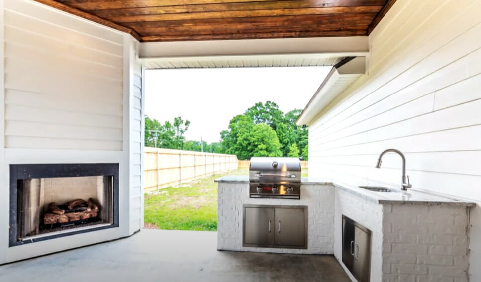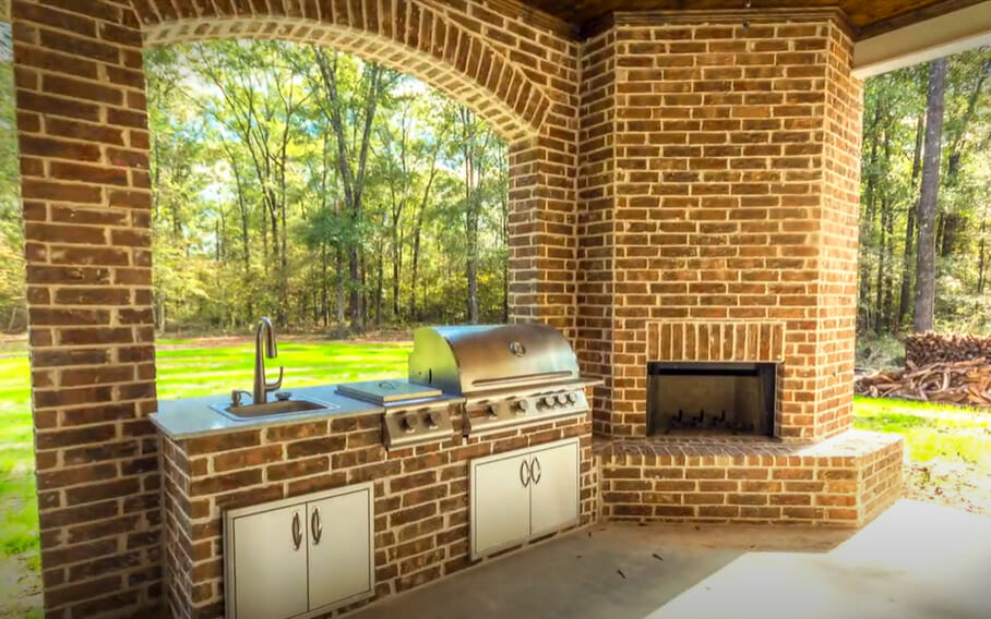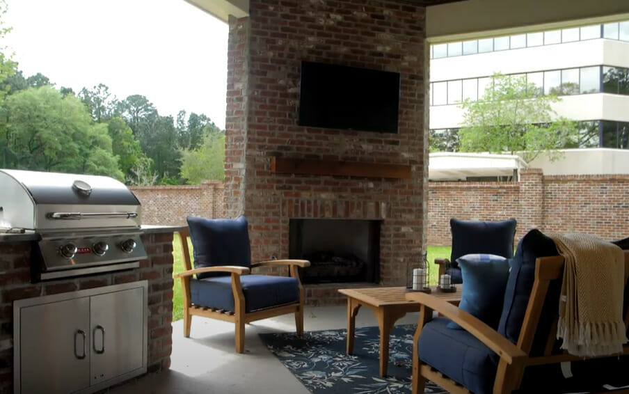 (00:50) – Some of the major things that we see clients request for their outdoor spaces are gas grills. We have side burners. You’ve got built-in trash cans, in-the-brick cabinetry with maybe a sink outside or a gas fireplace on the back patio. Definitely some ceiling fans because it gets very hot here.