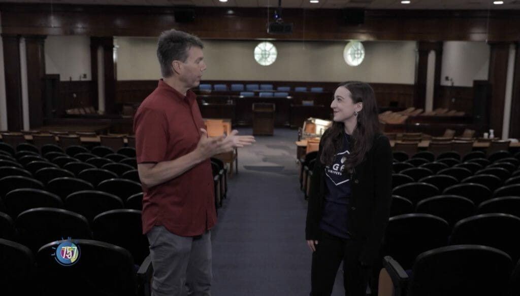 Julia walks Barry to Robertson Hall, where she shows him the Moot Court Room. This is where law students at the university can practice their courtroom skills!