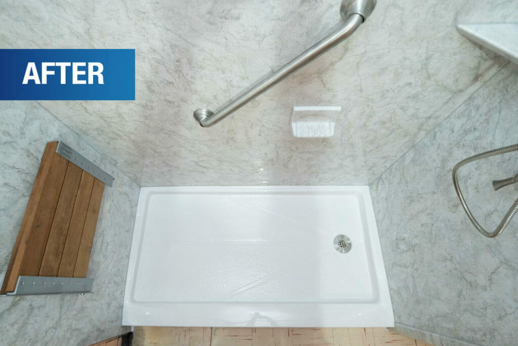 Now here’s the really great part. Your entire bathroom, including a new shower, or any safety features like grab bars or fold out seats or custom benches, can be remodeled in just…1…day.
