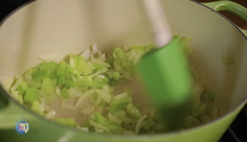 Add the onions and celery to your pan with oil, and cook until the onions are translucent and the celery starts to soften up. This usually takes about 3 minutes!